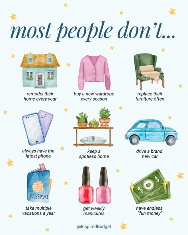 Większość ludzi nie kupuje kompletu ubrań co sezon (który, tak na marginesie, w sieciówkach zmienia się co dwa tygodnie… absurd…). Nie robi każdego roku renowacji domu czy mieszkania. Nie biegnie do salonu po każdej wiadomości operatora, że wprowadził na rynek nowy model telefonu. Większość ludzi nie jeździ na wakacje co kwartał, ani nie wymienia wszystkich mebli po zaanonsowaniu nowych trendów wnętrzarskich. No i nie ma nieograniczonego budżetu na rozrywkę i przyjemności.